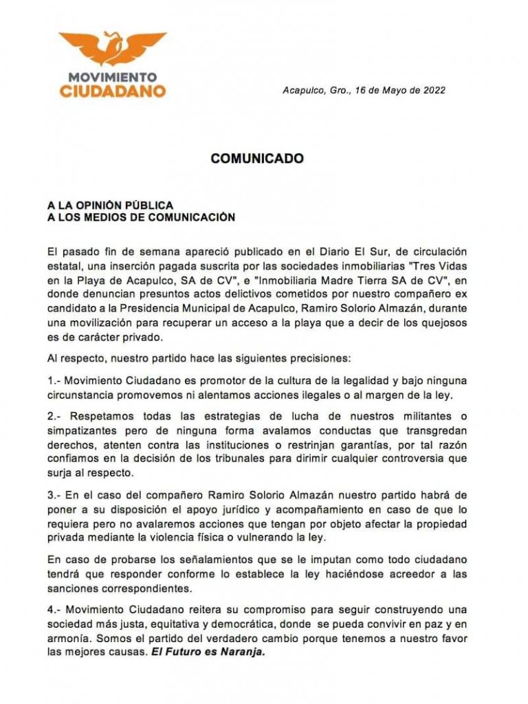 DigitaleZ. Christian Zamora / Acapulco. 17 de mayo.- “En caso de probarse los señalamientos que se le imputan como todo ciudadano tendrá que responder conforme lo establece la ley haciéndose acreedor a las sanciones correspondientes”, recalca el comunicado que anoche fue publicado en la cuenta oficial de Facebook de Movimiento Ciudadano Guerrero (MC), sobre el conflicto entre Ramiro Solorio Almazán y la empresa Tres Vidas.