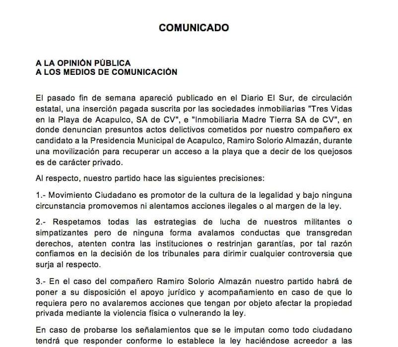 DigitaleZ. Christian Zamora / Acapulco. 17 de mayo.- “En caso de probarse los señalamientos que se le imputan como todo ciudadano tendrá que responder conforme lo establece la ley haciéndose acreedor a las sanciones correspondientes”, recalca el comunicado que anoche fue publicado en la cuenta oficial de Facebook de Movimiento Ciudadano Guerrero (MC), sobre el conflicto entre Ramiro Solorio Almazán y la empresa Tres Vidas.