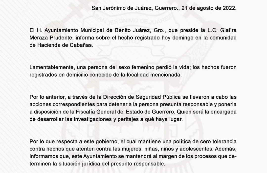 DigitaleZ / 22 de agosto del 2022. – María Rita García Barrientos, ex titular de la Dirección municipal de la Mujer de San Jerónimo de Juárez, en la Costa Grande de Guerrero fue asesinada a balazos en su casa presuntamente por su propio hijo.