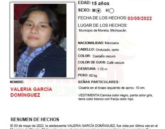 DigitaleZ. Karla Benítez / Acapulco. 15 de julio.- Valeria García Domínguez de 15 años de edad desapareció en Morelia, Michoacán, el 3 de