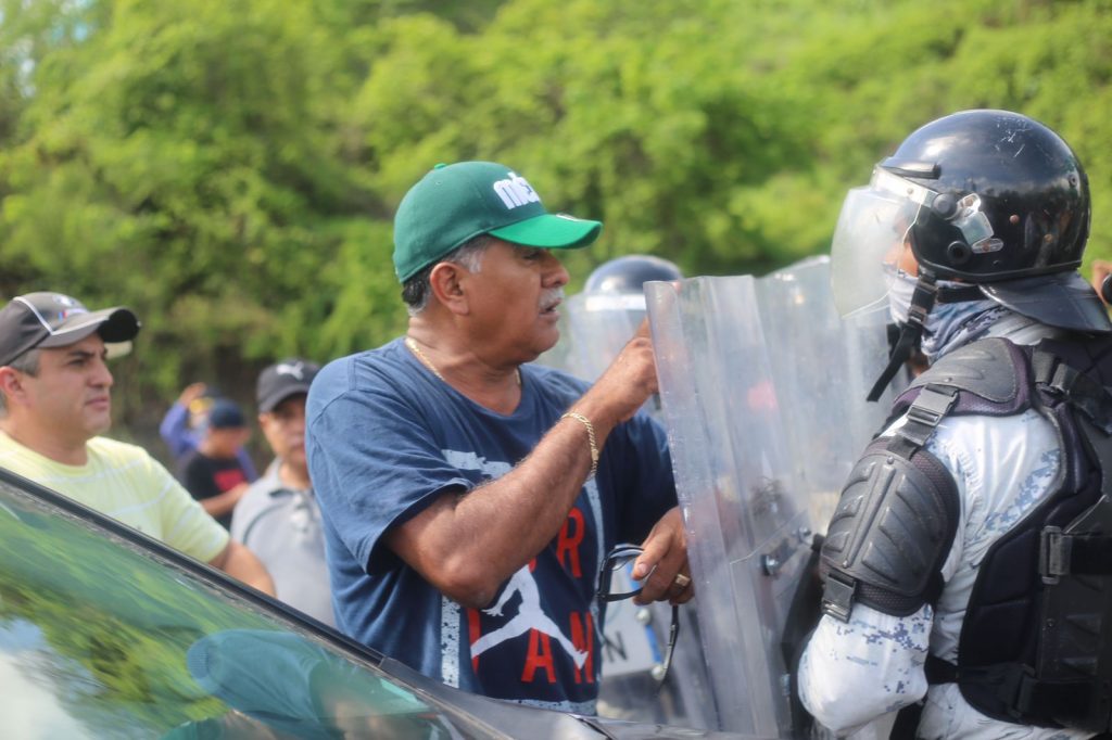 Tras una hora de bloqueo, turistas que intentaban entrar al puerto y que se quedaron varados se confrontaron con agentes antimotines de la GN y con padres de familia del Cobach.