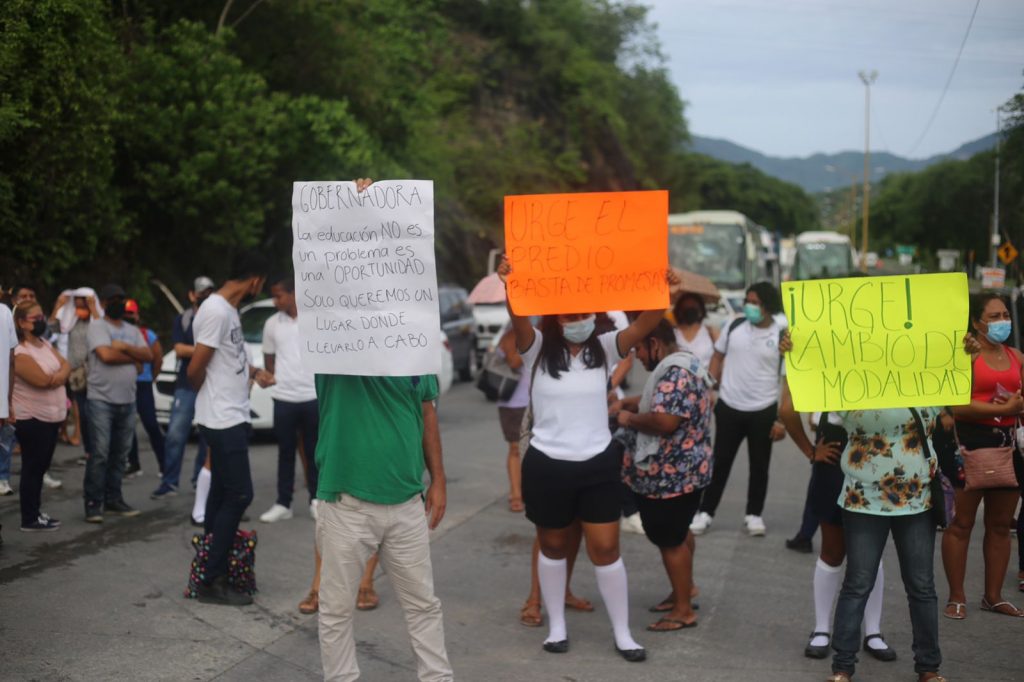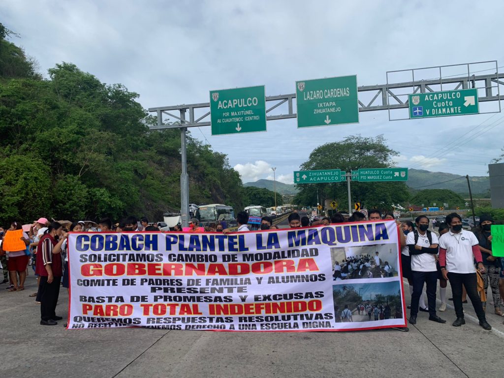 DigitaleZ. Karla Benítez / Acapulco. 17 de junio.- Padres de familia y alumnos del Colegio de Bachilleres (Cobach) de la colonia la Máquina de Acapulco, bloquean la caseta de La Venta, en la Autopista del Sol, para exigir que se les entregue un predio para construir un plantel.