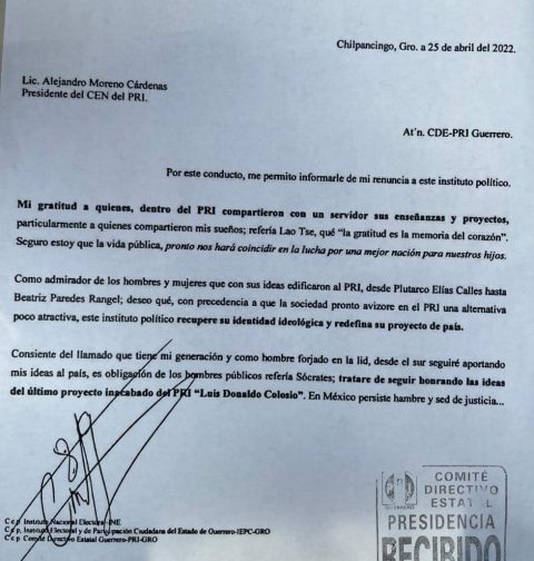 Exalcalde de Copala renuncia al PRI. Dice que el partido perdió identidad ideológica