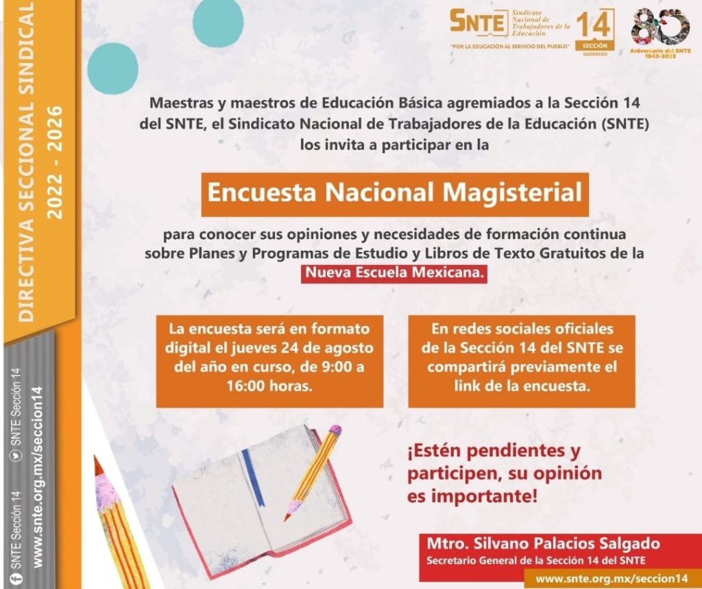 La Directiva Sindical de la Sección 14 del SNTE que encabeza el Mtro. Silvano Palacios Salgado dio a conocer que el Comité Ejecutivo Nacional del SNTE llevará a cabo la Consulta Nacional Magisterial para conocer la opinión y necesidades de formación continua de las maestras y los maestros sobre Planes y Programas de Estudio y Libros de Texto Gratuitos de la Nueva Escuela Mexicana.