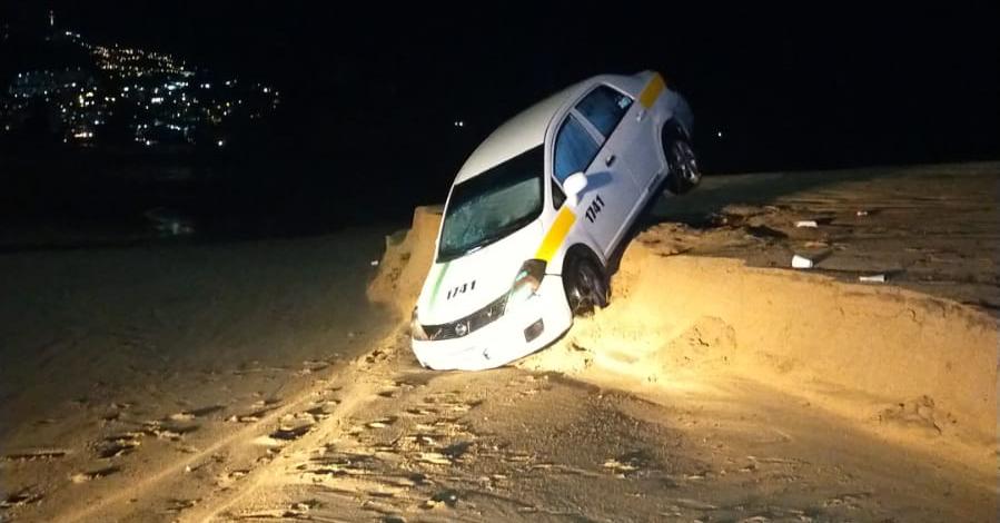 En la Costera del puerto un tercer vehículo fue arrastrada por las lluvias, de la calle hacia la franja de arena. El taxi de la ruta Colosio quedó varado entre el condominio Bugambilias y el hotel Playa Suites de la zona Dorada, área que se inunda en cada temporada.