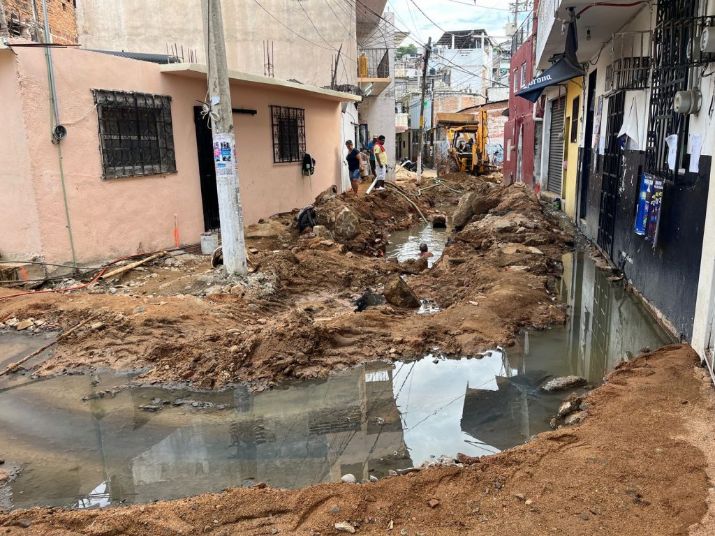 DigitaleZ. Karla Benítez / 09 de agosto.- Una obra inconclusa de drenaje de la Secretaría de Obras Públicas y Desarrollo Urbano municipal provocó que casas y negocios se inundaran de aguas negras y se suspendiera el servicio de agua potable en una calle de la colonia Centro, denunciaron vecinos de esa zona de Acapulco.