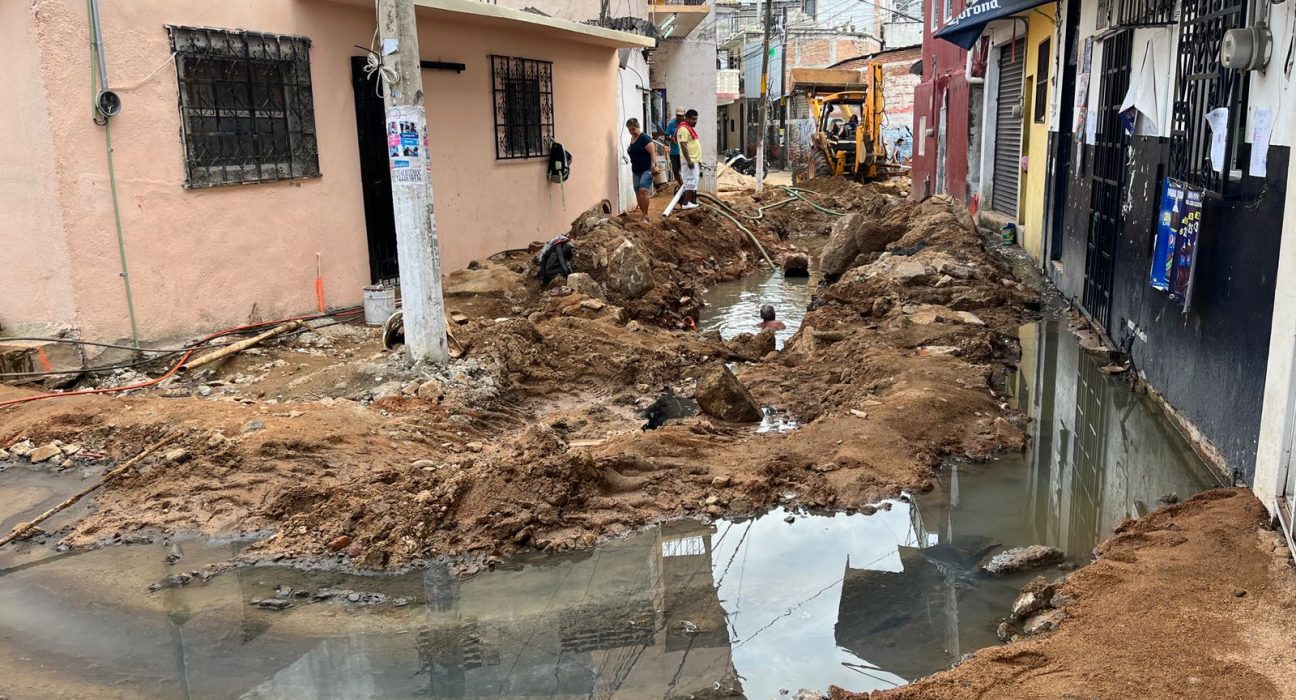 DigitaleZ. Karla Benítez / 09 de agosto.- Una obra inconclusa de drenaje de la Secretaría de Obras Públicas y Desarrollo Urbano municipal provocó que casas y negocios se inundaran de aguas negras y se suspendiera el servicio de agua potable en una calle de la colonia Centro, denunciaron vecinos de esa zona de Acapulco.