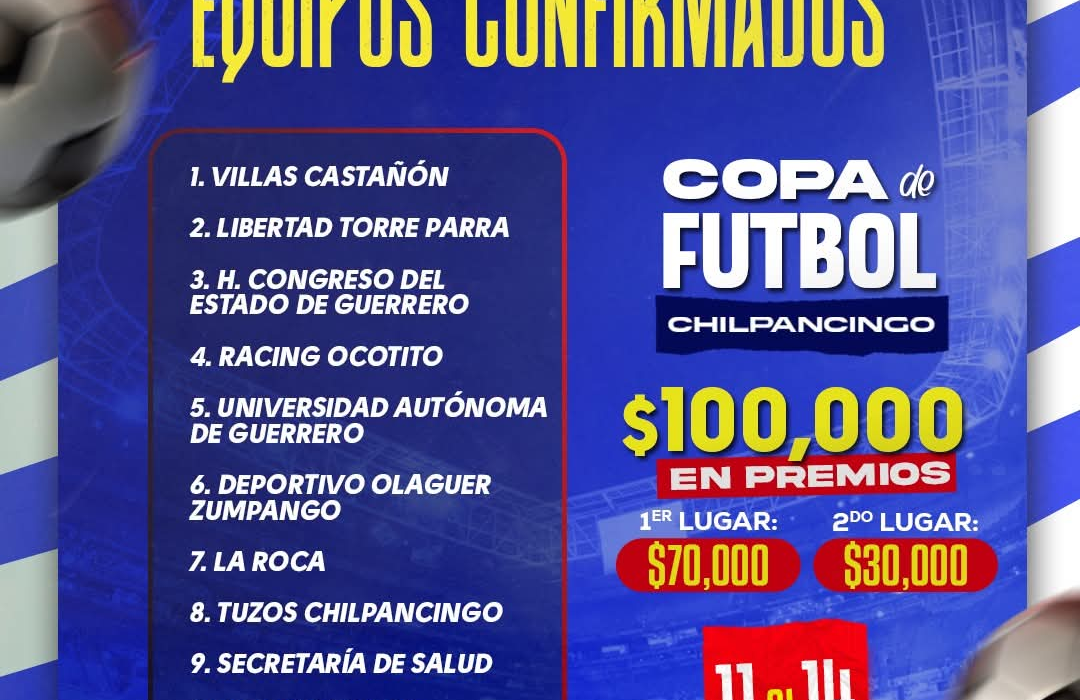 Por último, informó que este año participarán los equipos: Villas Castañón, Libertad Torre Parra, H. Congreso del Estado, Racing Ocotito, Universidad Autónoma de Guerrero, Deportivo Olaguer Zumpango, La Roca, Tuzos Chilpancingo, Secretaría de Salud, Deportivo CG y 100% Hecho en Guerrero. Además, reseñó que la copa es elaborada por artesanos de Xalitla y decorada con motivos históricos. Estuvo presente Jesús Memije Rodríguez, árbitro SEFOAR y representantes de los equipos participantes.