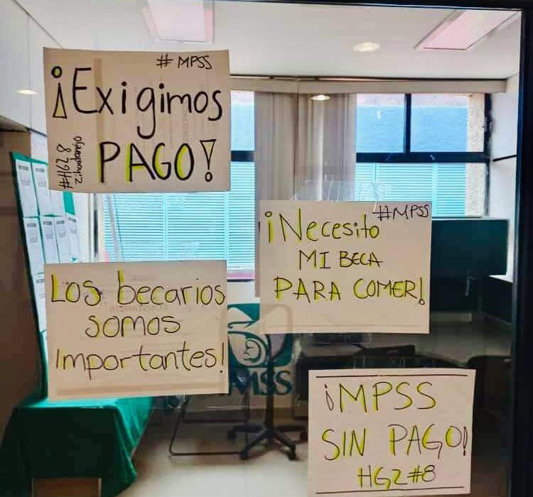 Los médicos manifestantes colocaron letreros en la entrada de la jefatura de enseñanza frente a la sub dirección médica, en el interior de la clínica del IMSS en este puerto, donde demandaron el pago de sus salarios, escribiendo frases como: “Los becarios somos importantes”, “Exigimos pago”, “Necesito mi beca para comer” y “MPSS sin pago”.